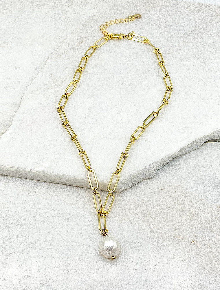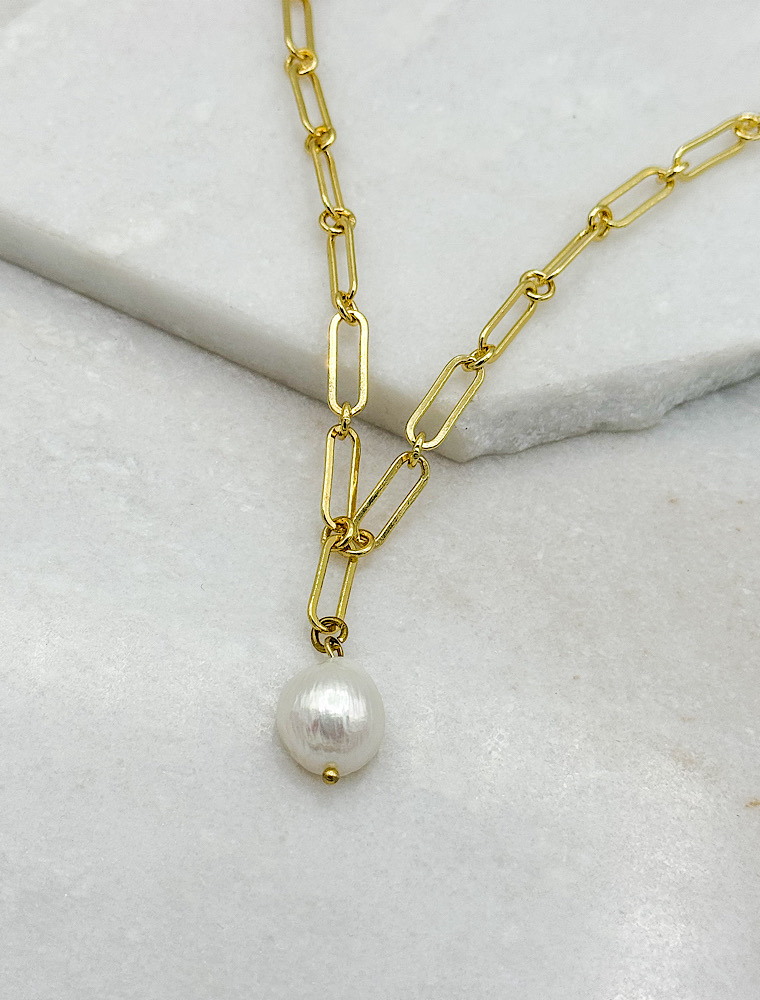 New for Spring/Summer 26 our Ainsley Paperlink 14k gold plated necklace is finished with a baroque pearl charm.