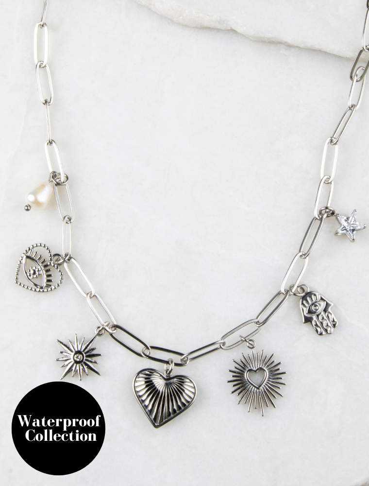 A gorgeous charm necklace for the silver lovers! Made up from 7 charms.Necklace is 43cm with a 5cm extender chain. Please email us to request a different size. Made from pvd coated stainless steel making it waterproof and tarnish free. Comes gift packaged in Olia branded packaging.