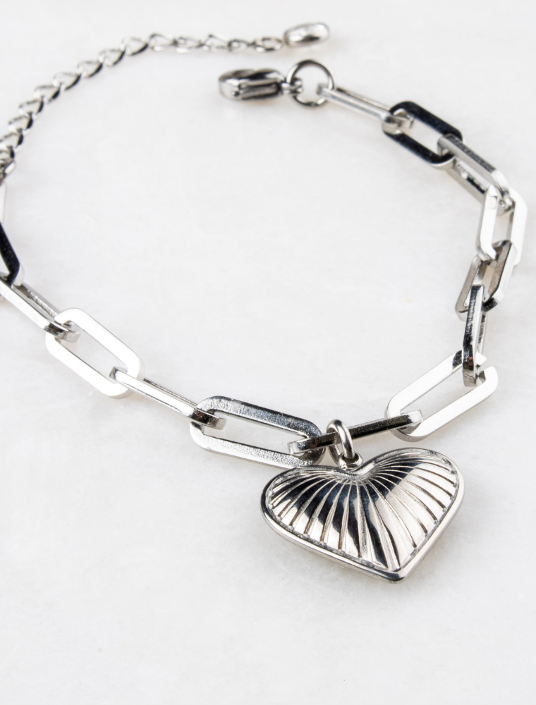 Crystal Ridge Heart Charm Chunky Paperlink Waterproof Bracelet -Silver/Stainless Steel