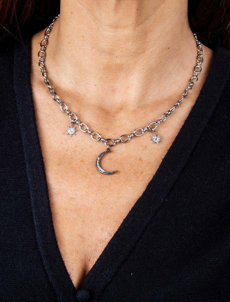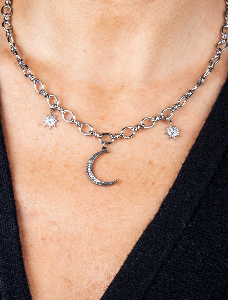 Lucinda Paperlink Waterproof Necklace with Moon & Star Charms – Silver/Stainless Steel