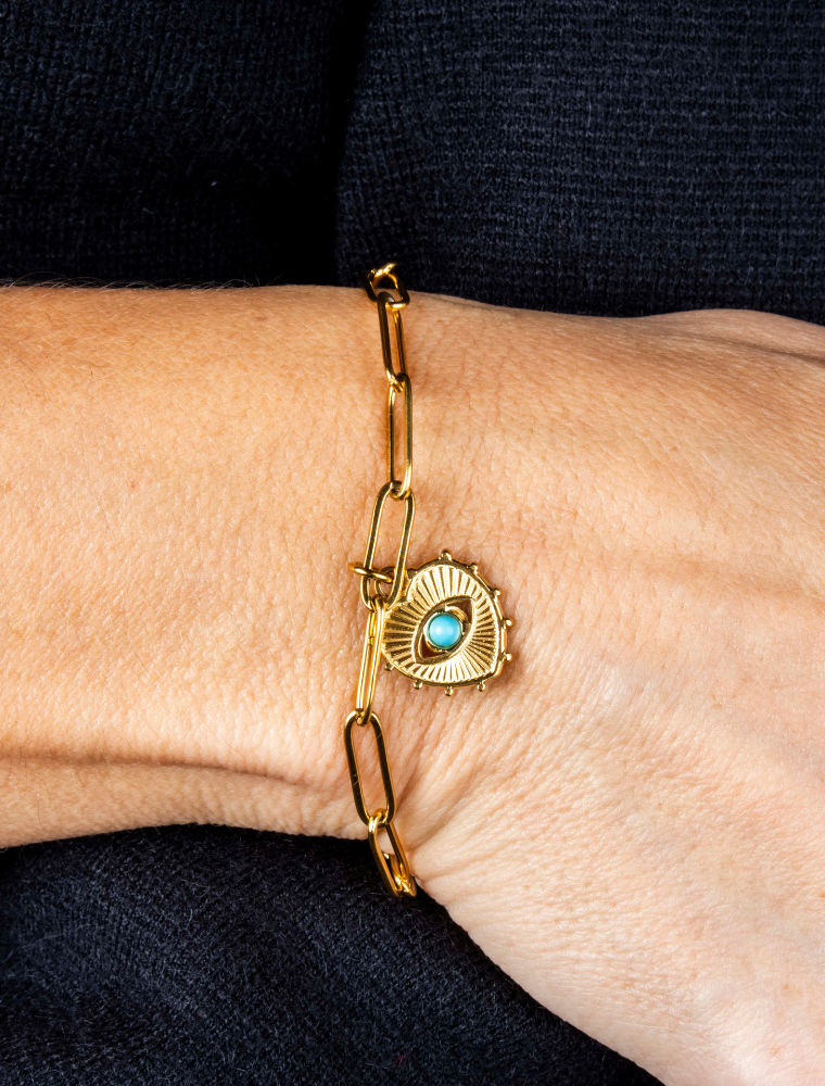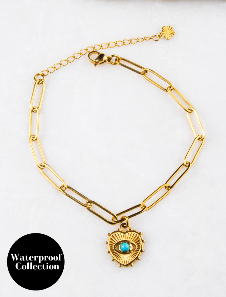 Orla Waterproof Paperlink Bracelet with Turquoise Eye Heart Charm – 18k Gold Plated/Stainless Steel