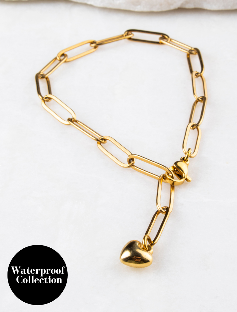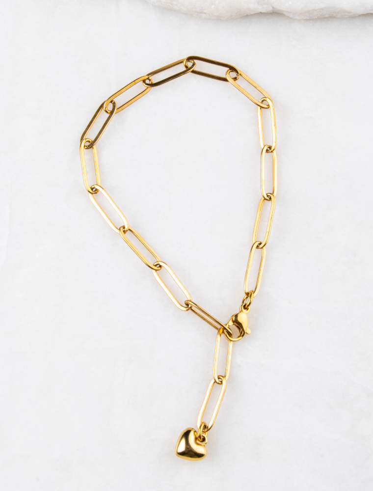 Adjustable paperclip chain gold plated bracelet with cute puffed heart charm. Maximum circumference of bracelet is 19.5cm.